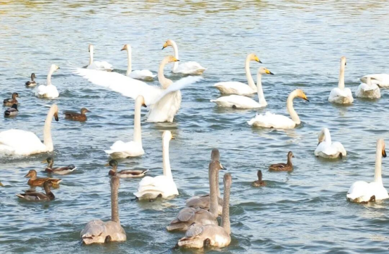 杜鹃河畔,数百只越冬天鹅自在游弋。