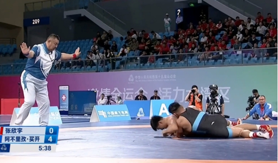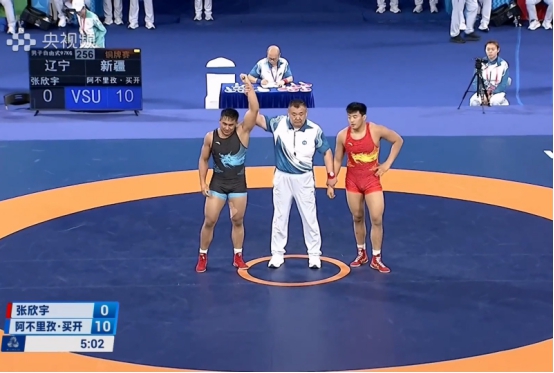 作为我国水平最高、影响力最大的综合性体育盛会,本届全运会男子自由式摔跤97公斤级赛场高手云集、竞争激烈。面对来自辽宁的强劲对手,阿不里孜·买开沉着冷静,攻防有度,凭借精准的控制、果断的出击和出色的节奏掌控,牢牢占据场上主动。在不到1分钟时间内,他便以10:0的技术优势锁定胜局,将铜牌收入囊中。
