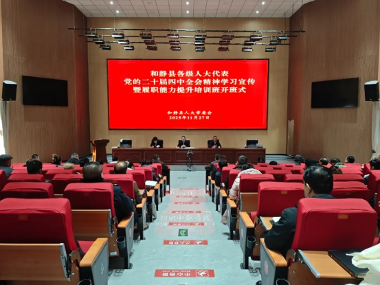 11月27日,和静县各级人大代表党的二十届四中全会精神学习贯彻暨履职能力提升培训班在县委党校开班。和静县领导包金喜、杨承东、敖云等参加开班仪式。