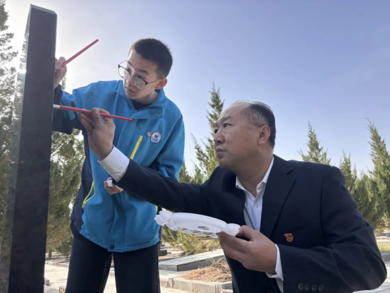 随后,大家手持工具,分组清扫陵园环境卫生,细致擦拭烈士墓碑与纪念碑,用实际行动守护英烈安息之地。部分学生参与“红色描碑”活动,用毛笔饱蘸红漆,一笔一划为碑文描红,让烈士英名在春日暖阳中熠熠生辉,也将红色记忆深深镌刻在心底。