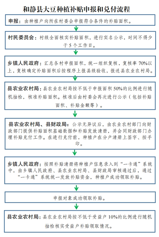 (五)补贴面积申报和兑付方法。由种植户据实向村委会申报符合条件的补贴面积,村级全面核实,进行实名公示,时间不得少于5个工作日。乡(镇)复核,县农业农村部门核实认定。县农业农村部门核准补贴面积后,再次由村委会进行公示(包括补贴面积、补贴金额等),时间不得少于5个工作日。公示无异议后,由农业农村部门向财政部门提供补贴面积基础数据和补贴发放清册,并会同财政部门办理补贴兑付工作。