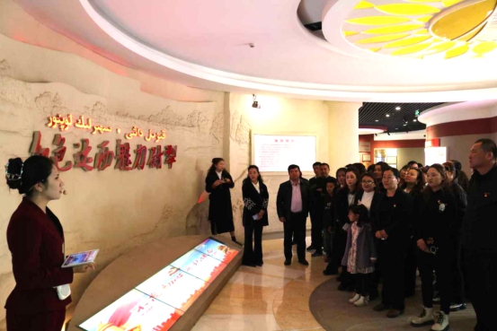 达西村作为全国民族团结进步模范集体,为此次学习提供了生动实践课堂。在爱国主义教育基地,党员们驻足习近平总书记回信展板前,认真聆听讲解,深刻领会"口袋里要鼓囊囊,精神上要亮堂堂"的村训内涵,真切感受党中央对边疆发展和民族团结工作的深切关怀。走进村史陈列馆,丰富的文献实物系统展现了达西村在党的领导下从贫困村落蜕变为"南疆第一村"的奋斗历程,让党员们直观体会到各族群众手足相亲、休戚与共的深厚情谊,进一步坚定了听党话、跟党走的信念。