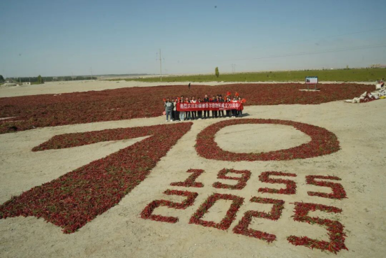 为庆祝新疆维吾尔自治区成立70周年,全乡干部群众携手用新鲜辣椒在晾晒场精心摆出“70”巨型字样,以乡土特色方式传递对家乡的热爱与祝福。