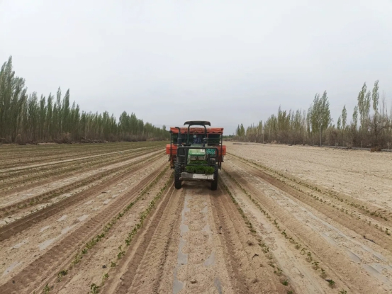 春日暖阳普照,田间生机盎然。4月14日,和静县哈尔莫墩镇乌兰尕扎尔村辣椒种植基地里,全自动移栽机来回穿梭,村民们分工协作、抢抓农时,有条不紊地开展辣椒幼苗移栽工作,一行行翠绿的辣椒苗整齐扎根田间,奏响了春耕生产的奋进乐章。